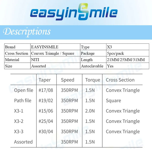 EASYINSMILE Dental Endodontic Rotary File X3 NITI Engine Files 21/25/31MM Never Break Series For Endo Motor 5Files/pack