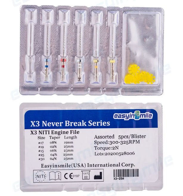 Endodontic File rotary X3 Twisted never breaking file Easyinsmile is a new invention using twisted NITI material in order to prevent the dentists away from breaking file accidentally or technically inside the root canal.