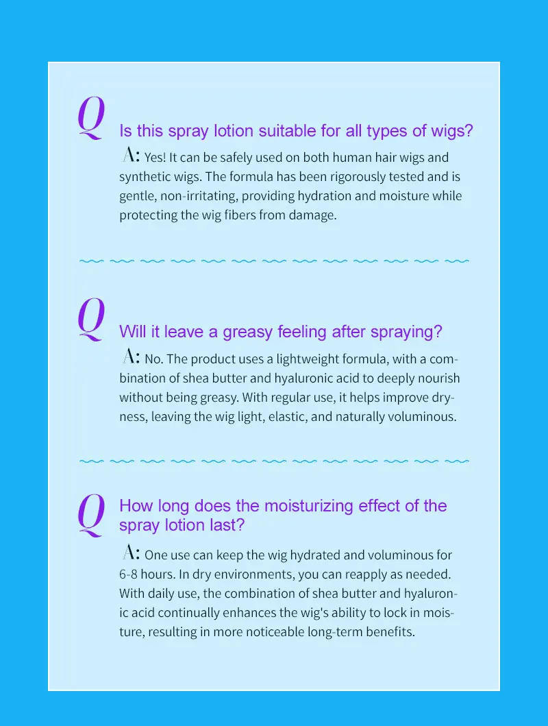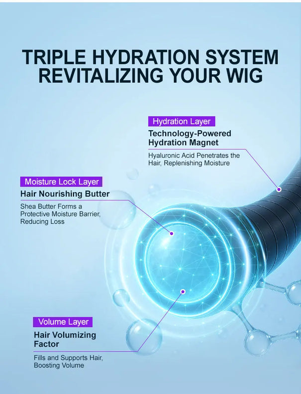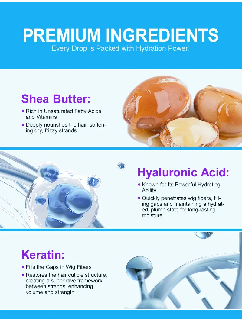 Infused with shea butter, keratin, and hyaluronic acid, this deeply nourishing and hydrating formula restores moisture while adding natural volume. Effectively targets dryness, tangles, flatness, and static, bringing back a soft, silky, and naturally lustrous wig texture.