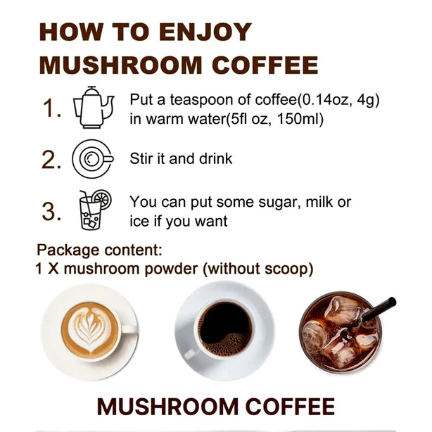 It's easy to use and tastes great. 180g (recommended daily dose 6g) of premium mushroom coffee blend can be easily added to your morning routine, smoothie, or simply mixed into hot or cold water. This powder dissolves perfectly in a variety of liquids including milk, tea, or your other favorite beverage. You can enjoy the health-boosting benefits every day. No scoop provided.