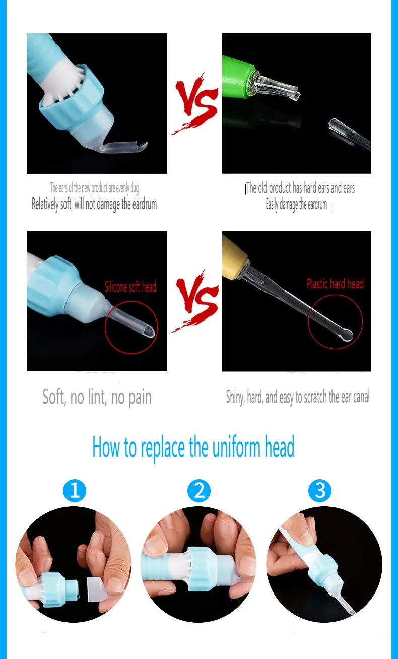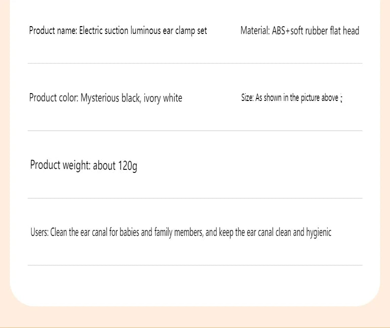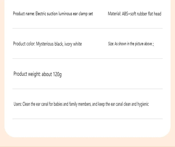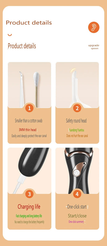 • Electric Earpick :This electric earpick is a modern solution for earwax removal, providing a clean and efficient way to maintain ear hygiene for both children and adults.