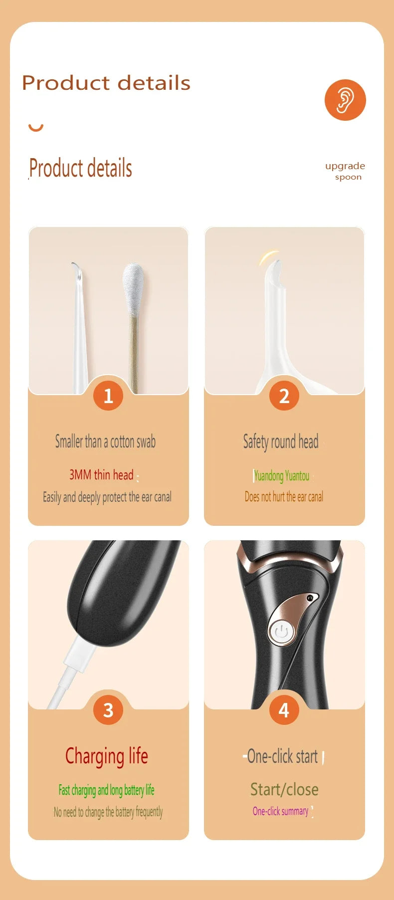 • Efficient Cleaning :The electric design of this earpick allows for quick and effective earwax removal, ensuring a clean and comfortable ear experience.