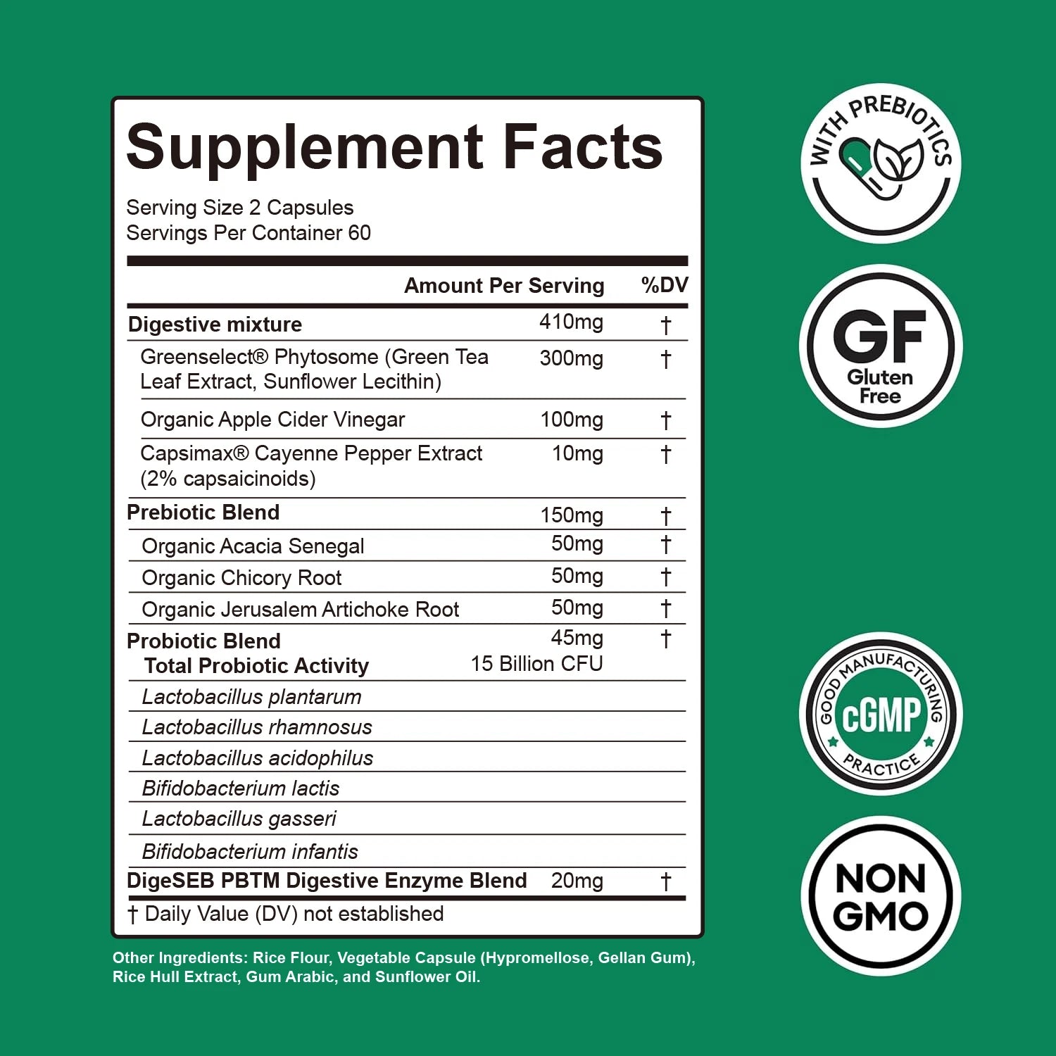 Ingredients: Probiotic blend, prebiotic blend, apple cider vinegar