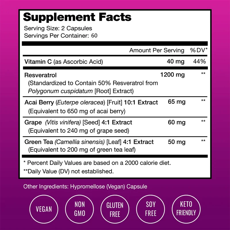 Potent Antioxidant Blend: Our resveratrol formula is enhanced with powerful extracts of grape seed, acai berry, green tea leaf, and vitamin C.